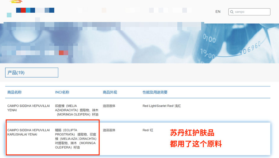 首先检测出苏丹红的护肤品、彩妆品,里面大多都加了一个原料,这个原料里面有3个成分:鳢肠提取物+印度楝叶提取物+辣木籽油,然后是这个原料里面含有苏丹红,并不是护肤品牌主动加了苏丹红这个成分,很多博主都没搞清楚这个事实,就在那里拉踩品牌。